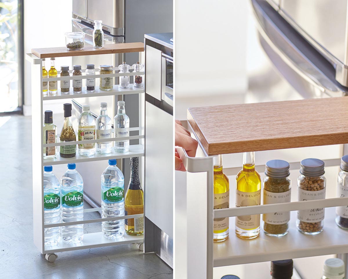 冰箱和台面之间的尴尬差距,想知道您应该怎么做?用这款苗条的手推车填充它,该手推车的宽度为13厘米,三层和方便的木制上衣。使用它来存储您的香料和油或其他烹饪要素。